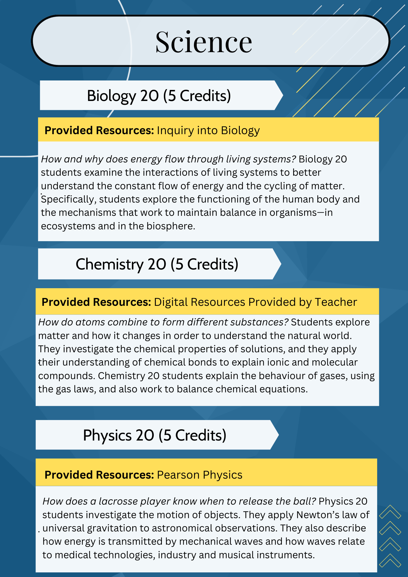 | Biology 20 | Chemistry 20 | Physics 20 | ||